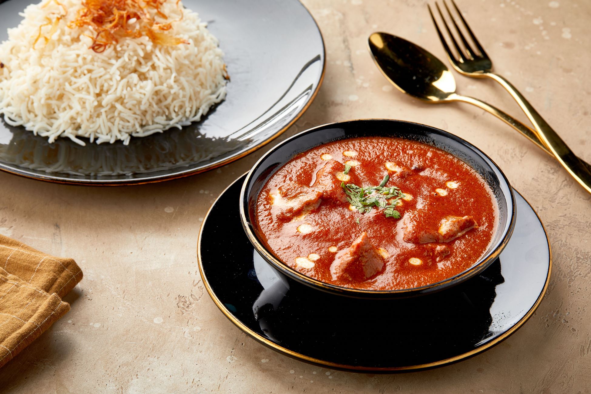 دجاج بلا عظام مطبوخ مع صلصة الطماطم ، زبدة و تتبلية ودار نورة التوابل الخاصة يقدم مع الأرز الأبيض.