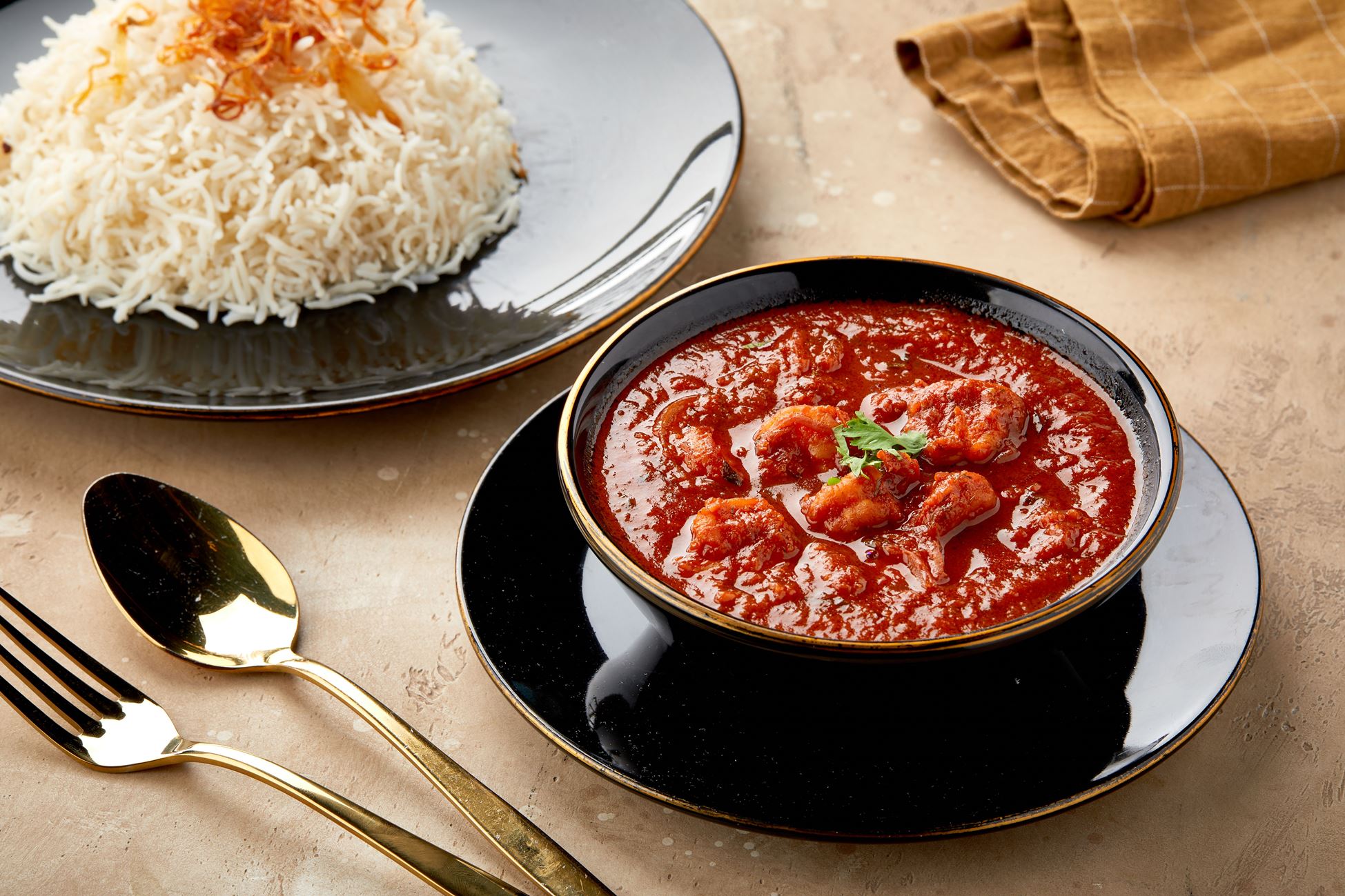 ربيان ,بصل , طماطم مطبوخ ببهارات دار نورة المميزة يقدم مع الرز الابيض