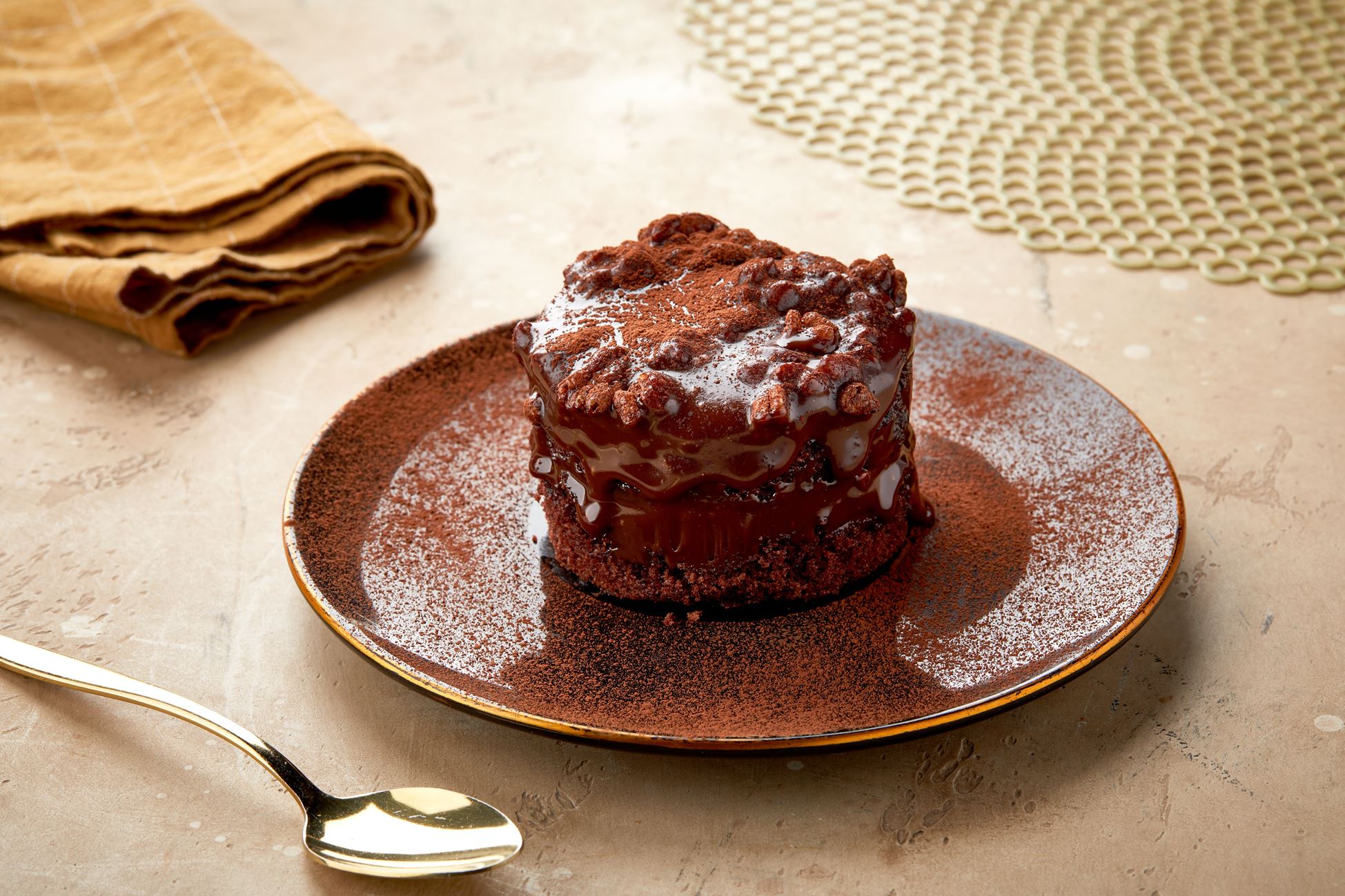 طبقة من كيك الشوكلاته الاسفنجي مزين بالكراميل مع الكرانشي بوبس