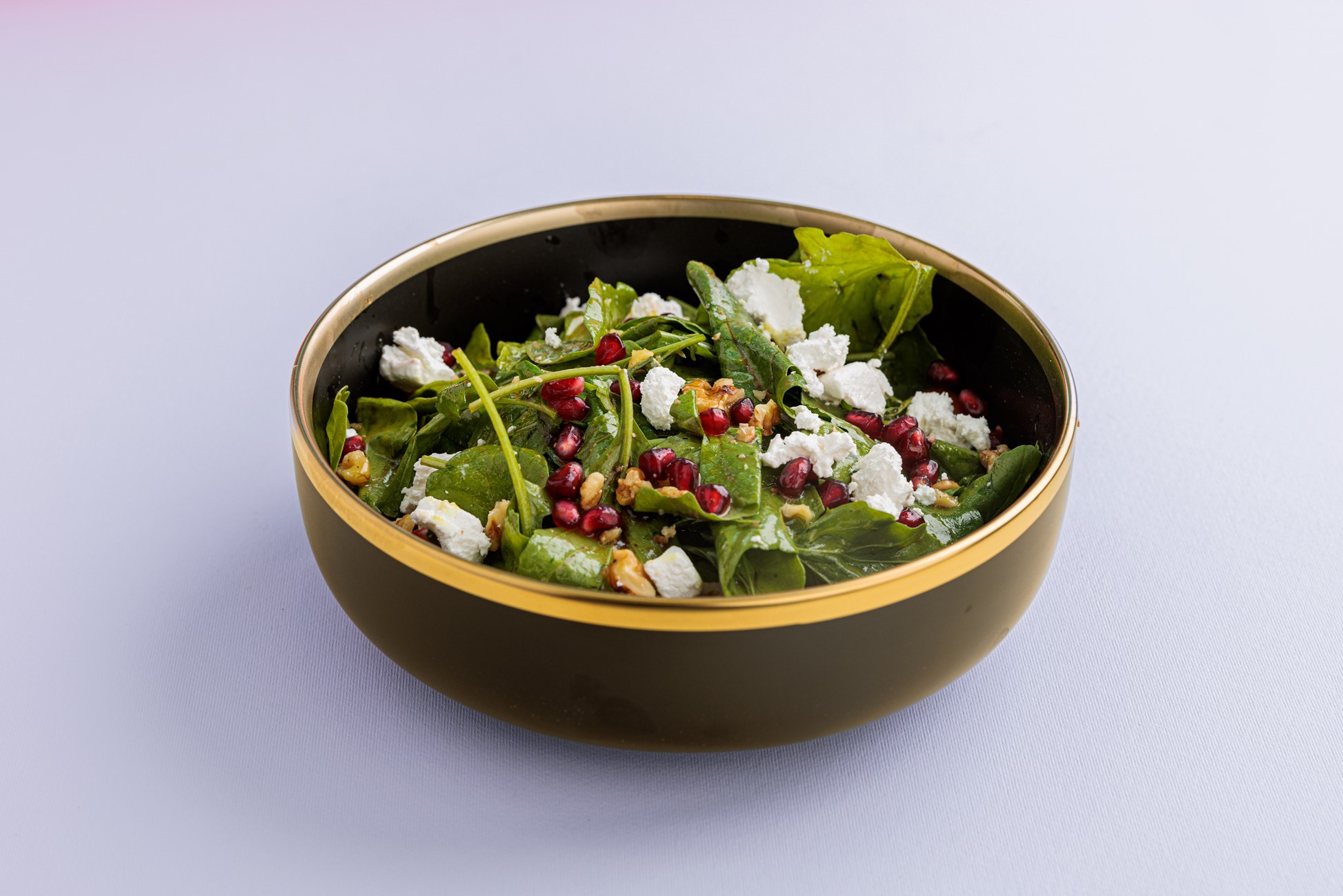 جرجير محلي ، جوز ، جبنة فيتا ، رمان طازج ، تقدم مع صلصة الليمون وصلصة دبس السكر