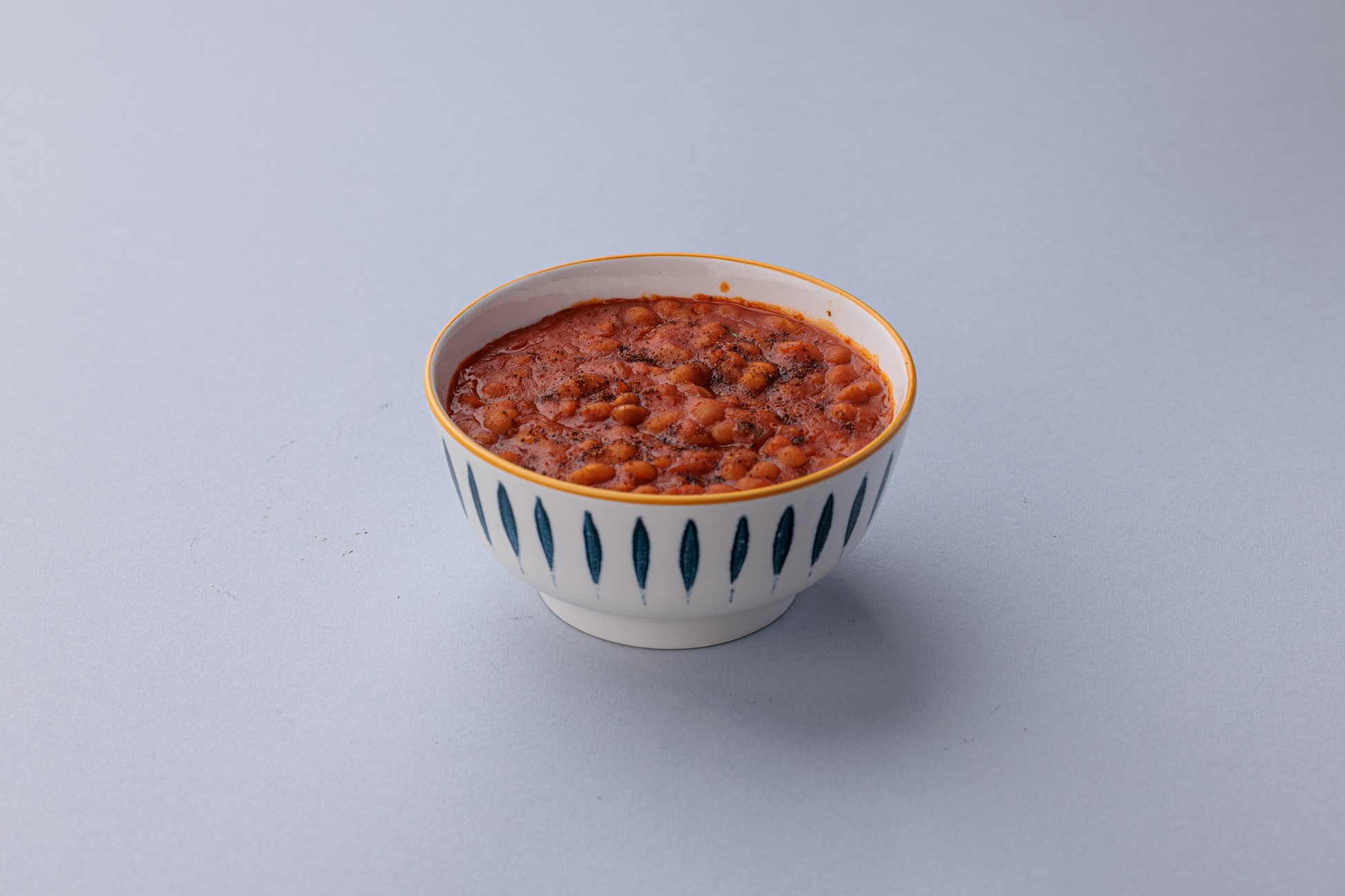 فاصوليا حمراء صحية مطبوخة مع البصل والطماطم الطازجة ومزينة بمسحوق السماق. تقدم مع خبز دار نورة المميز