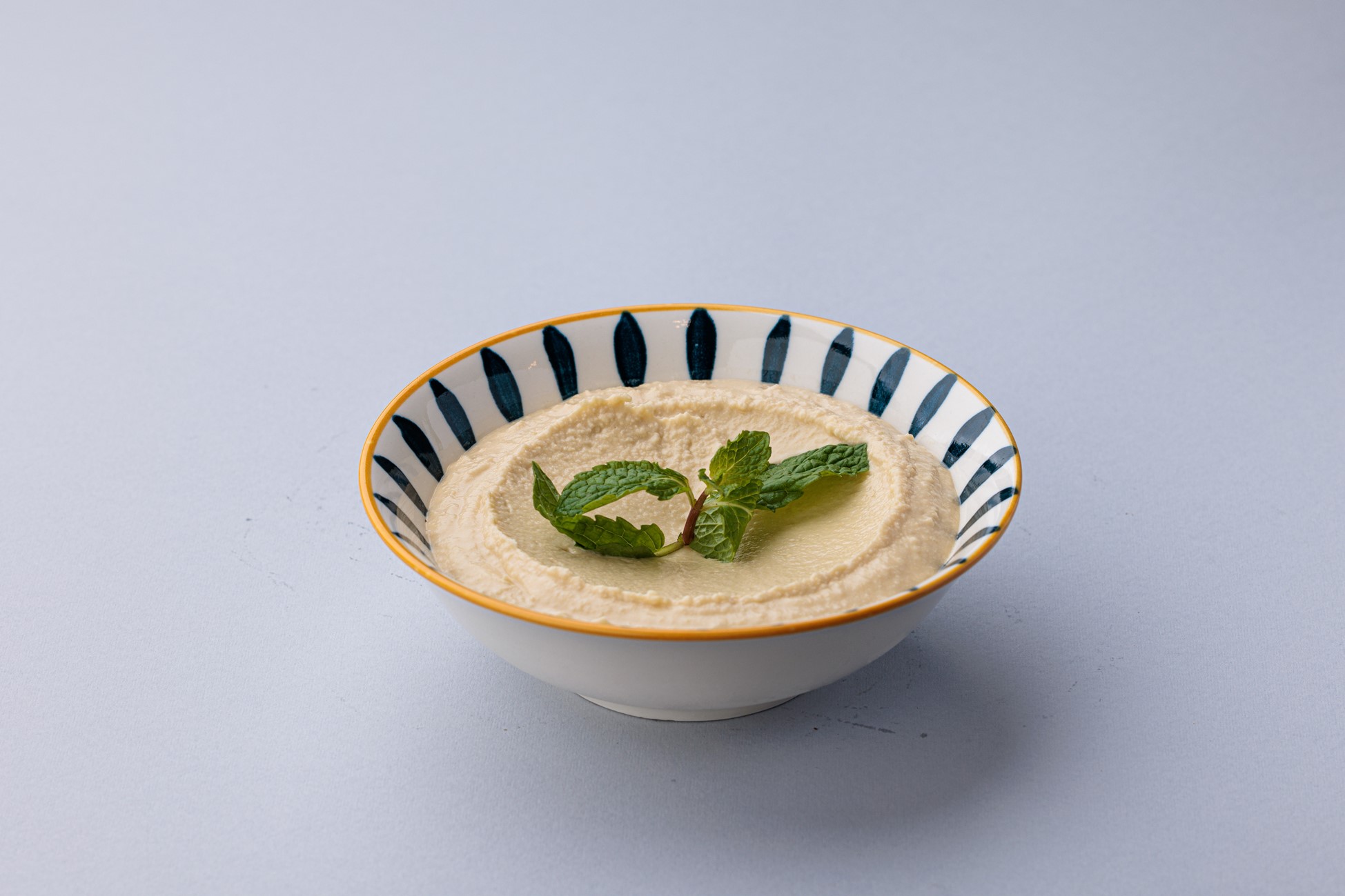 معجون الحمص الطازج مع الطحينة وعصير الليمون وزيت الزيتون والثوم مزين ببودرة البابريكا والنعناع تقدم مع خبز دار نورة المميز