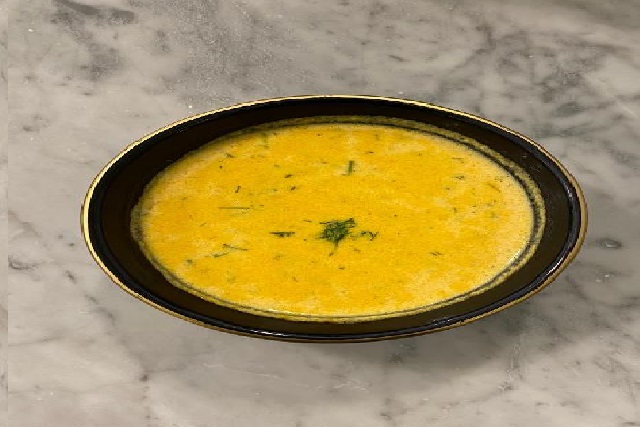 شوربة مكس بالمأكولات البحرية بأوراق الشبت والكريمة محضرة منزليا تقدم مع الليمون