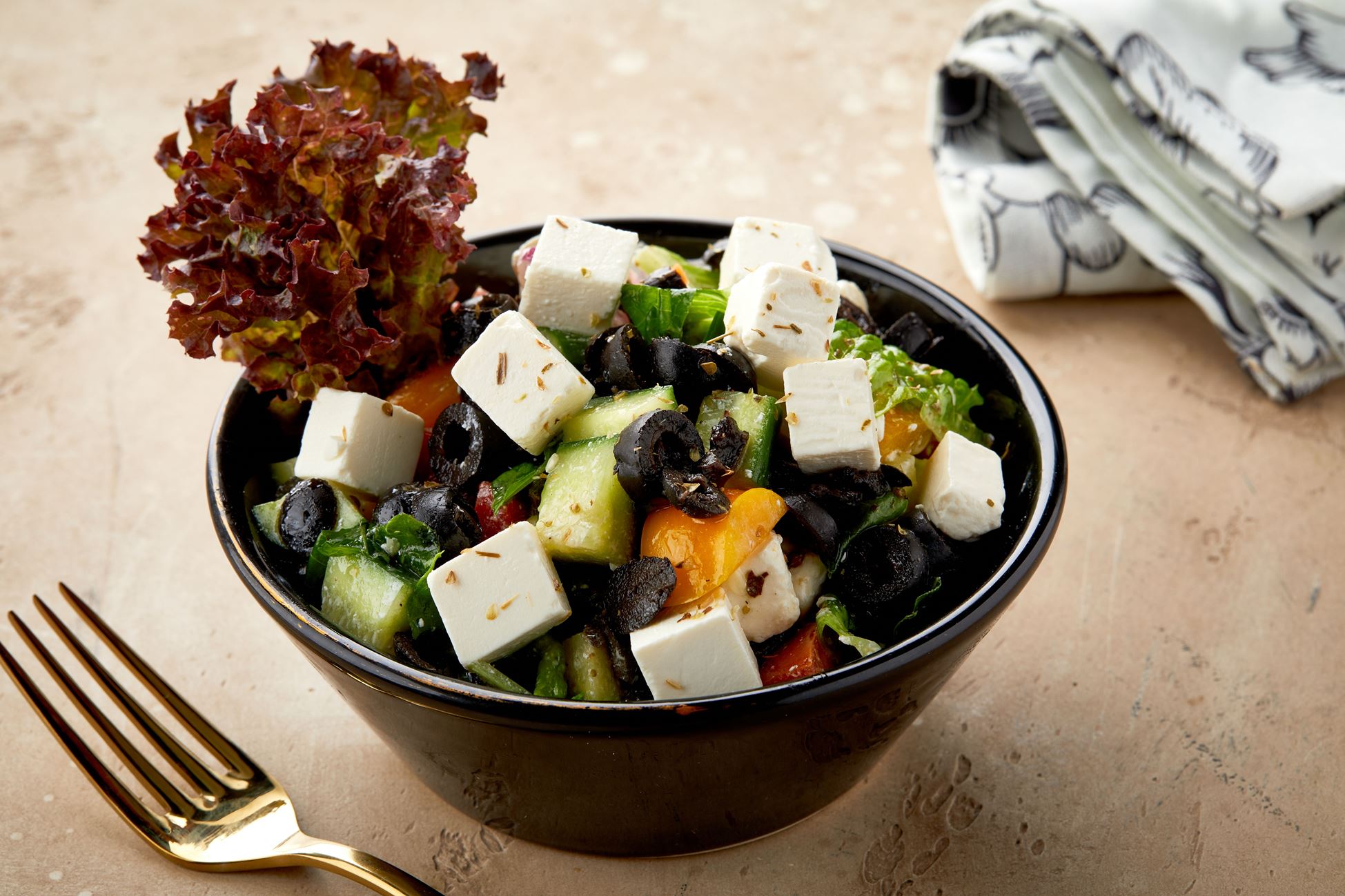 الخيار الطازج، 3 أنواع من الفلفل البارد، البصل الأحمر والخس وجبن الفيتا متبلة بصلصة الليمون و الخل