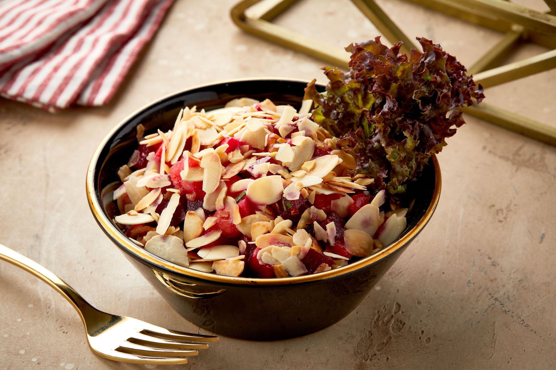 الشمندر المسلوق ،أناناس ، الجوز واللوز المحمص مع خلطة خردل العسل و مزين بقطع من اللوز