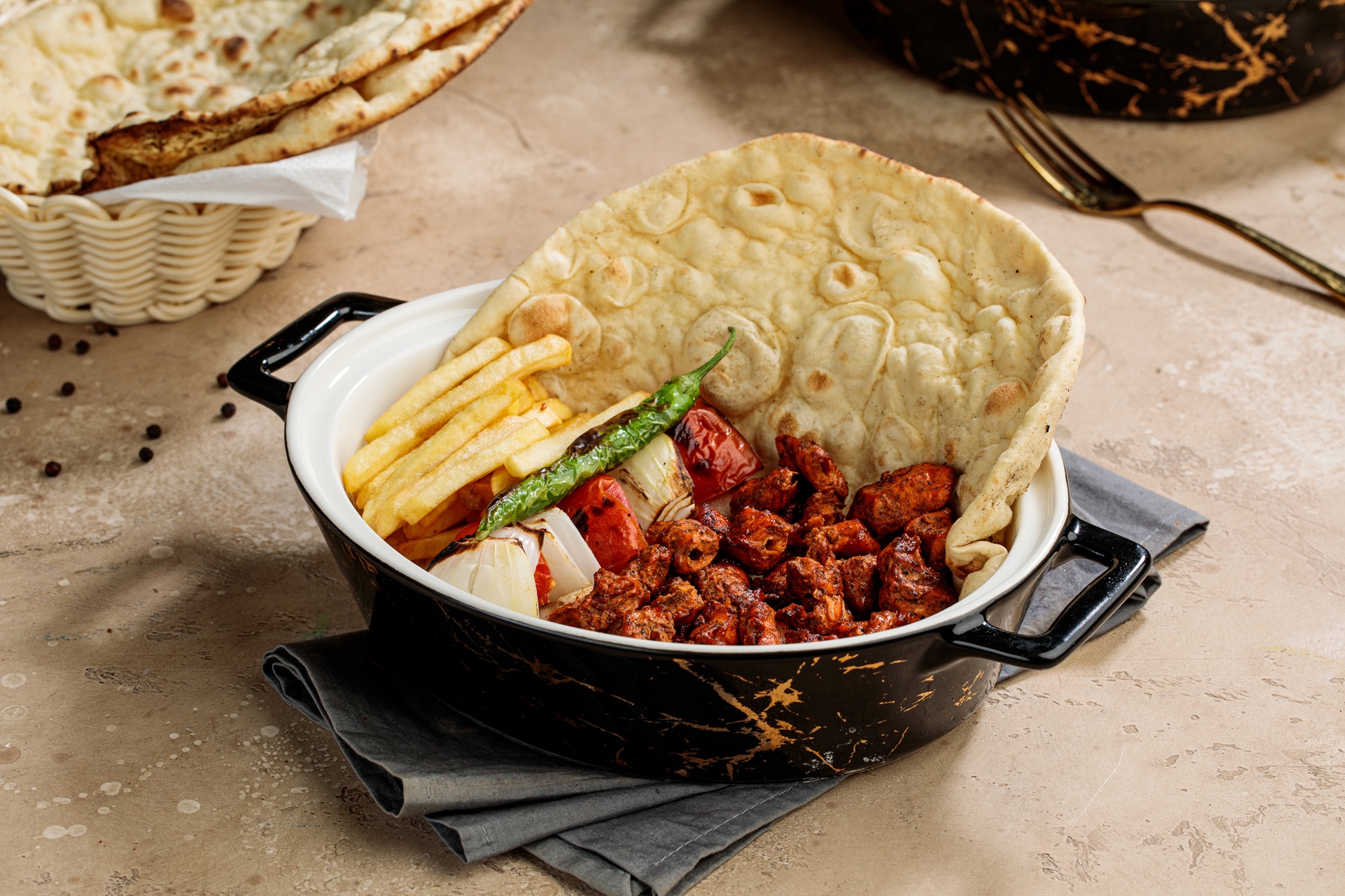 أفخاذ الدجاج الطازج متبل بالتتبيلة البحرينية المنزلية تقدم مع الطماطم المشوية ، و البصل، و الفلفل الأخضر والبطاط المقلي ، مع خبز دار نورة الطازج المميز