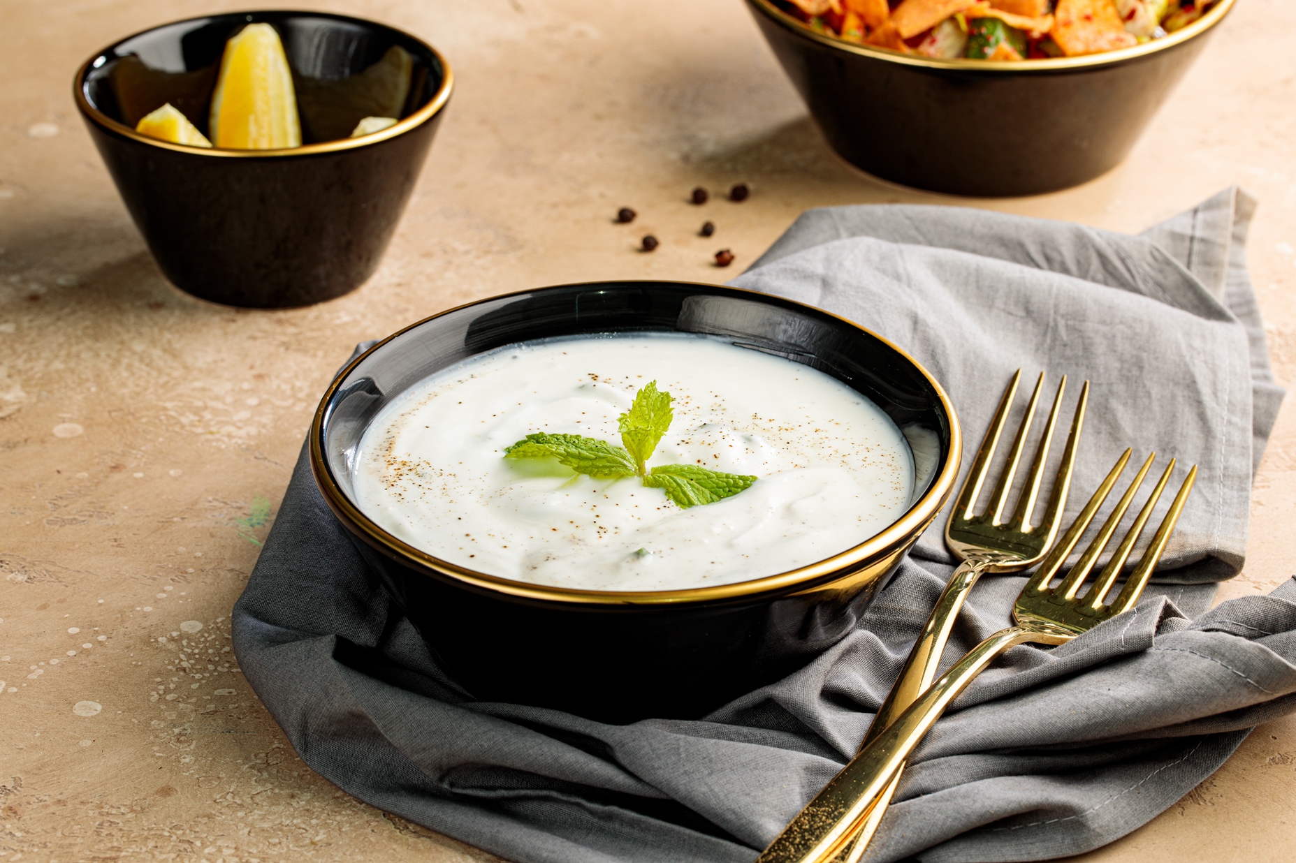 سلطة الخيار بالروب تتميز بطعمها المنعش, الشلطه تقدم بارده بقوام ثخين من الروب والخيار المقطع مع النعناع المنعش.